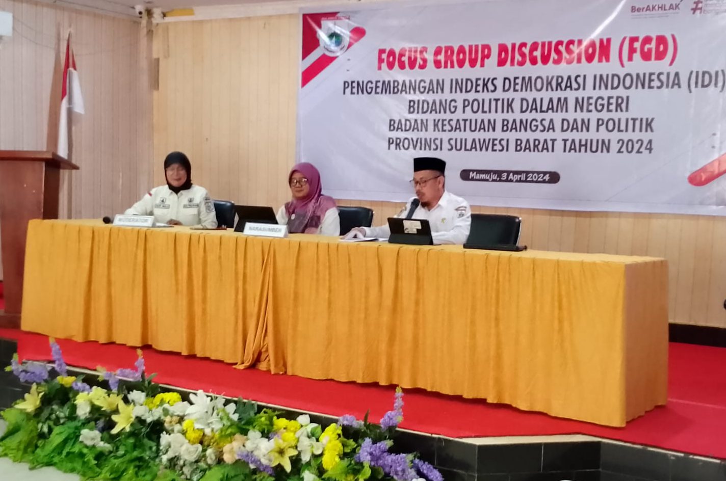 Mamuju. Badan Kesatuan bangsa dan Politik Provinsi Sulawesi Barat melalui bidang politik dalam negeri, menggelar kegiatan Focus Group Discussion (FGD) Pengembangan indeks Demokrasi Indonesia (IDI), di Hotel Berkah Mamuju, Rabu 3 April 2024.